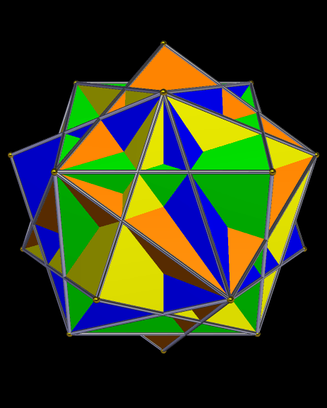 To make the compound of five cubes, begin with a dodecahedron, as seen above. Next, add segments as new edges, and let them be all of the diagonals of all the dodecahedron’s faces. Then, remove the pentagonal faces, as well as the original edges. What’s left is five cubes, in this arrangement.