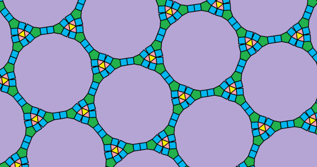 I’m afraid I lack the time to talk about this in more detail today, but, Robert Loves Pi, a geometry-oriented blog, has a lovely tessellation that you might like to see. Tessellations are ways to cover a surface, usually a plane, with an, ideally, small set of a couple pieces infinitely repeated. As a field of mathematics it’s more closely related to kitchen floors than the usual, but it’s also wonderfully artistic, and the study of these patterns brings one into abstract algebra.
