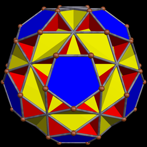 This next image is of the same polyhedron, but with a different coloring-scheme. In this second version, each face has its own color — except for faces which are parallel, with those faces given the fame color.