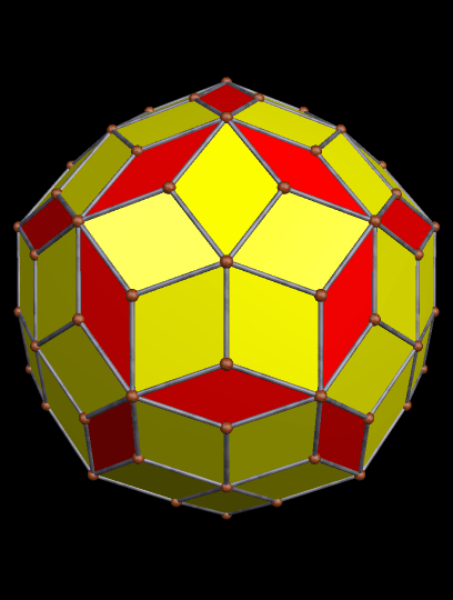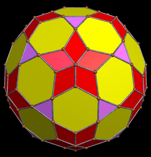 For the sake of comparison, here is a similar polyhedron (included in Stella 4d‘s enormous, built-in library of polyhedra) which is recognized as a near-miss to the Johnson solids. (I do not know the name of the person who discovered it, or I would include it here — I only know it wasn’t me.) It’s called the “half-truncated truncated icosahedron,” and its longest ledges are just over 7% longer than its shorter edges, with the non-regularity of faces also limited to isosceles triangles. However, this irregularity appears in all of the triangles in the polyhedron below — and in the “near near-miss above,” the irregularity only appeared in some of the triangular faces.