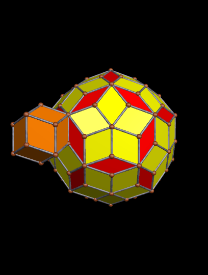 The program I use to make these rotating images, Stella 4d (which you can try here), has a function called “try to make faces regular.” If applied to the convex hull above, this function leaves the triangles and pentagon regular, and makes the octagons regular as well. However, the rhombi become kites. The rectangles merely change, getting slightly longer, while rotating 90º, but they do remain rectangles.