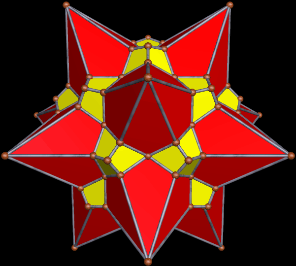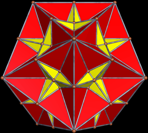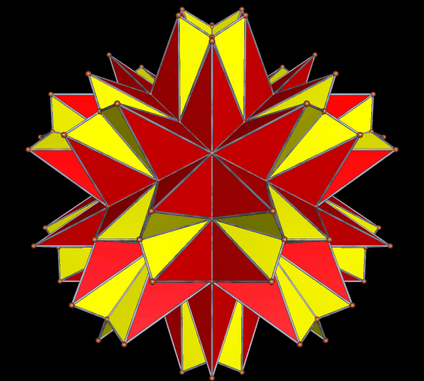 The polyhedron above is the 20th stellation of the icosidodecahedron — the one that appeared as the sole image in the last post here, but with completely different colors. The next one shown is the 31st stellation.