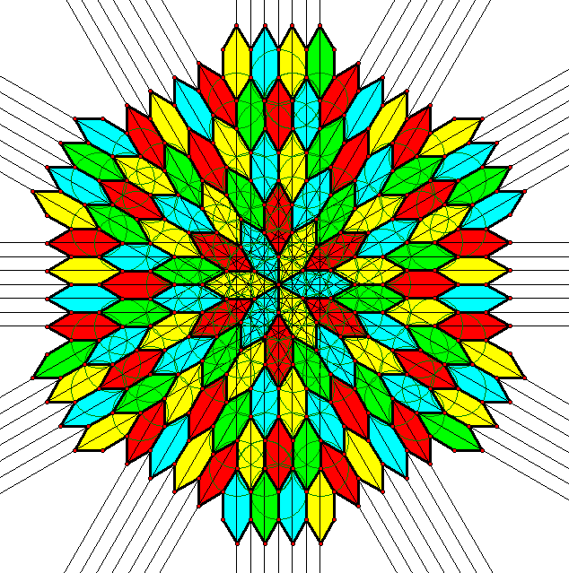 This left out order-6, of which I show many examples below. As it turns out, this particular radial tessellation lends itself particularly well to a variety of coloring-schemes. In the first picture, the construction-circles, -points, and -lines I used are shown; in the rest, they are hidden.
