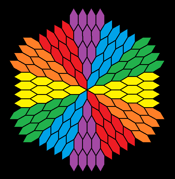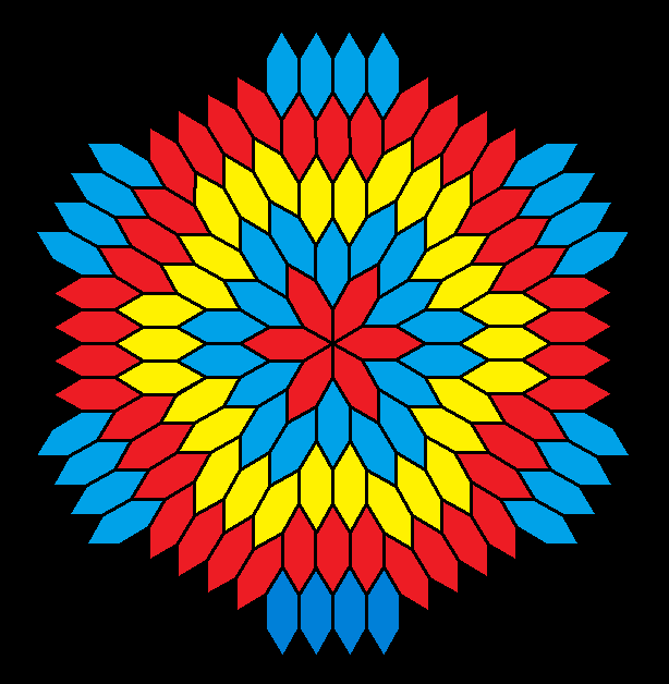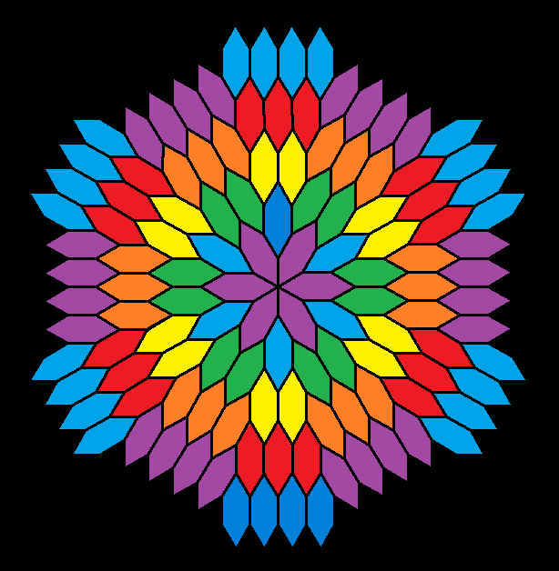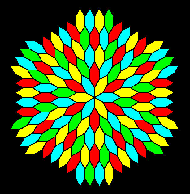 I explored radial tessellations of the plane, using only hexagons, in this earlier post. Order-three tessellations of this type are the familiar regular-hexagon tessellations of the plane. With higher-order all-hexagon radial tessellations, though, the hexagons must be elongated, although they can still remain equilateral, and all congruent, with bilateral symmetry. In that previous post, examples were shown of order 4, 5, and 8, in addition to the familiar order-3 regular-hexagon tessellation.