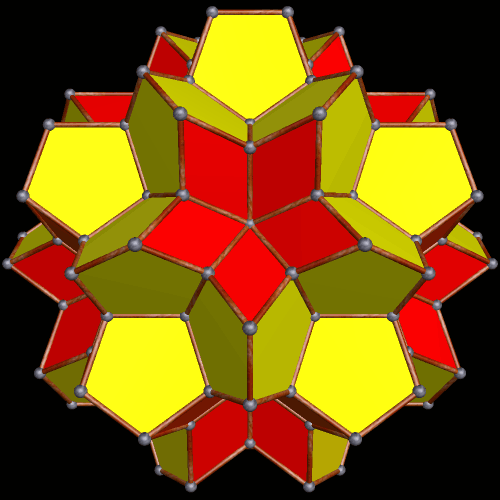 34th stellation of the Small Ditri Icosidodeca Published 22 January 2016 at 500 × 500 in 87 Rotating Non-Convex, Non-Chiral Polyhedral Images Featuring Icosidodecahedral Symmetry, Plus Four Which Snuck In with Cuboctahedral Symmetry — Can You Find All the Intruders?