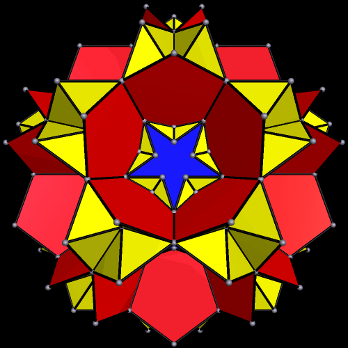 Faceted Icosidodeca six reg decagons going through center twelve star pentagons 30 golden rectangles nth stellation more n and more Published 22 January 2016 at 500 × 500 in 87 Rotating Non-Convex, Non-Chiral Polyhedral Images Featuring Icosidodecahedral Symmetry, Plus Four Which Snuck In with Cuboctahedral Symmetry — Can You Find All the Intruders?