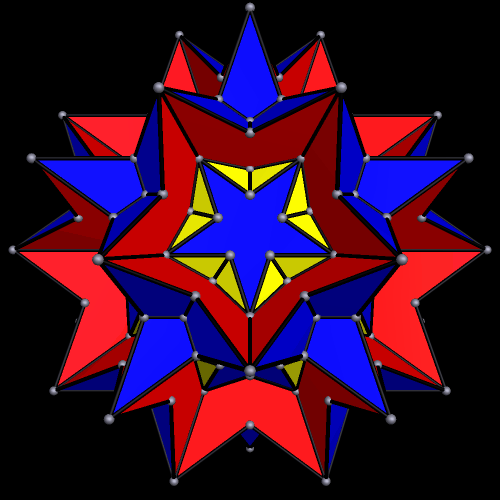 Faceted Icosidodeca six reg decagons going through center twelve star pentagons 30 golden rectangles nth stellation Published 22 January 2016 at 500 × 500 in 87 Rotating Non-Convex, Non-Chiral Polyhedral Images Featuring Icosidodecahedral Symmetry, Plus Four Which Snuck In with Cuboctahedral Symmetry — Can You Find All the Intruders?