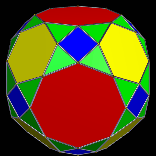 To form this polyhedron, I started with the great rhombcuboctahedron, then formed its base/dual compound. I then took the convex hull of this compound, and then formed the dual of that convex hull, producing the polyhedron you see above. All of this was done using Stella 4d: Polyhedron Navigator, which you can try for free at http://www.software3d.com/Stella.php.