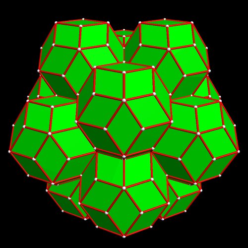 To make this, I started with the rhombic hexecontahedron (shown in this post), and then I augmented its twelve indentations with rhombic triacontahedra. I did this using Stella 4d, which you can try for free right here.