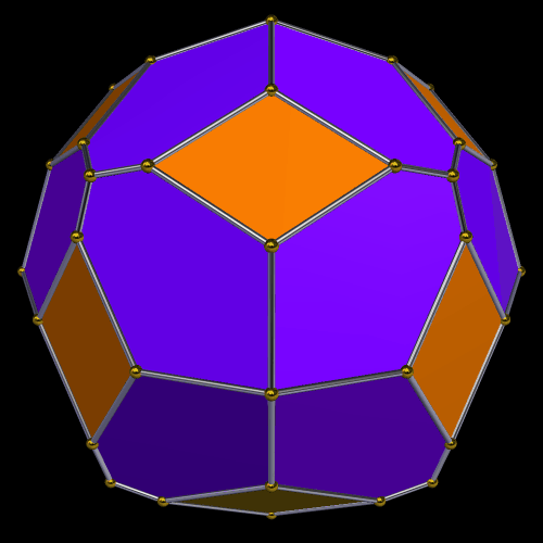 Of the 36 faces of this polyhedron, 12 are rhombi, while the other 24 are irregular hexagons. I made it using Stella 4d, which you can try for free right here.