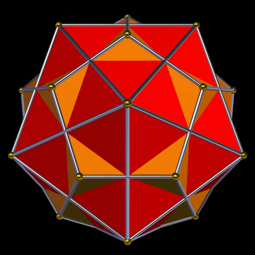 This appears to be a three-part compound, with two familiar components: the icosahedron (red) and the dodecahedron (orange). Remove those two components, and you get this:
