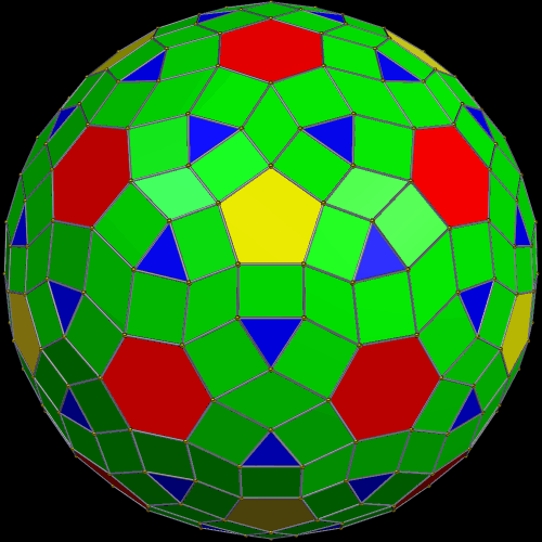 This solid has, as faces, 12 regular pentagons, 20 regular hexagons, and 60 isosceles triangles, along with a bunch of quadrilaterals of various types. I made it using Stella 4d, which you can try for free at this website.