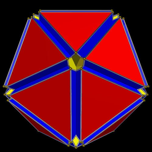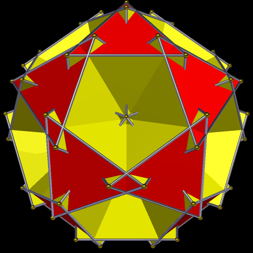 I also tried augmenting the great icosahedron with prisms, and this is the result — a variant of the Archimedean icosidodecahedron.