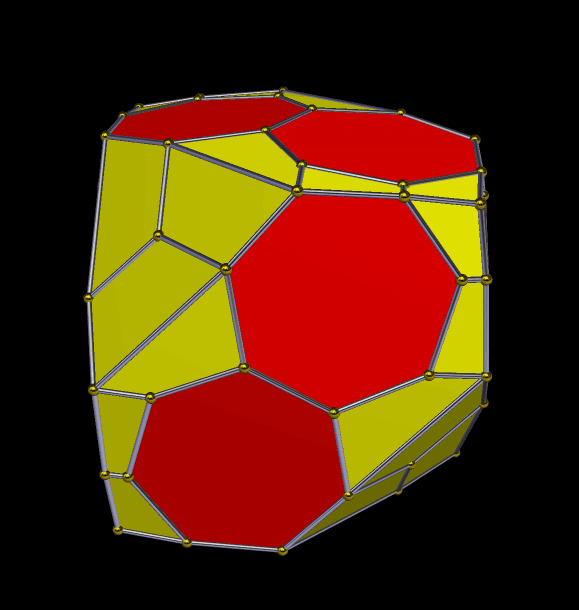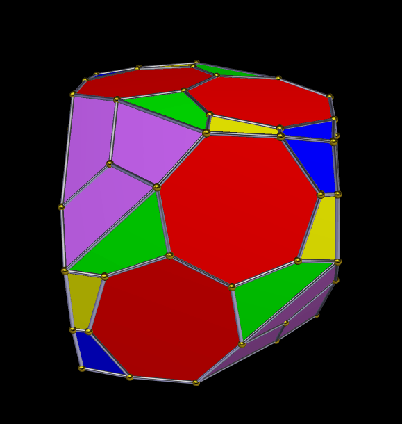 There are four different shapes of quadrilaterals here, but they have one thing in common: there are twelve of each of them. Add those 48 quads to the twelve regular heptagons, and that gives a total of 60 faces. I found this polyhedron while playing with the snub dodecahedron, using Stella 4d: Polyhedron Navigator, a program you can try for free right here.