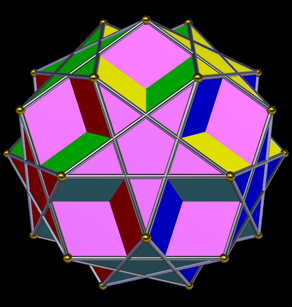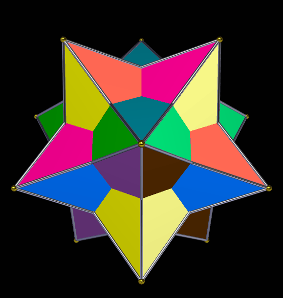 I found this polyhedron by faceting the icosidodecahedron in such a way as to get twelve pentagons and twelve pentagrams as faces. Once I had done so, the result looked familiar, so I checked the uniform solids (a class of polyhedra I don’t yet know well), and found it there. Here is its dual, the medial rhombic triacontahedron.