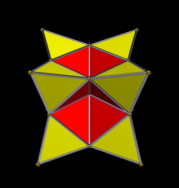 To make this, I started with the cuboctahedron, then augmented its triangular faces with tetrahedra. Next, I excavated the square faces with square-based regular pyramids, producing what you see here. I did this using Stella 4d, a program you may try for free at this website.