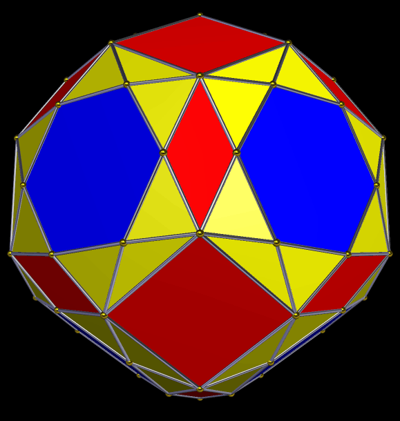 This polyhedron has fourteen regular faces: six squares, and eight hexagons. Its irregular faces include twelve rhombi, 24 obtuse isosceles triangles, and 48 acute scalene triangles, for a total of 98 faces. It has cuboctahedral symmetry. I made it using Stella 4d, a program you may try for free at http://www.software3d.com/Stella.php. The first image shown here has the faces colored by face type, while the second image shows what it looks like in “rainbow color mode.”