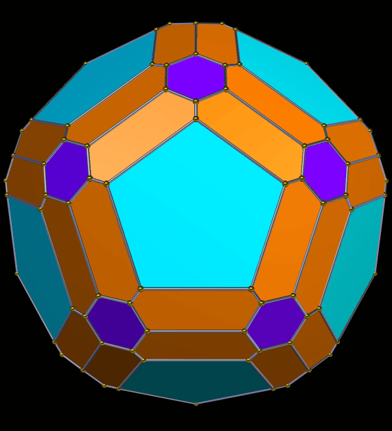 This polyhedron’s faces include twelve regular pentagons, twenty regular hexagons, and sixty elongated convex hexagons. I made it using Stella 4d, which you can try for free at http://www.software3d.com/Stella.php.