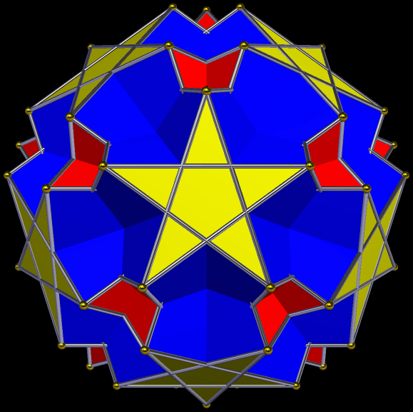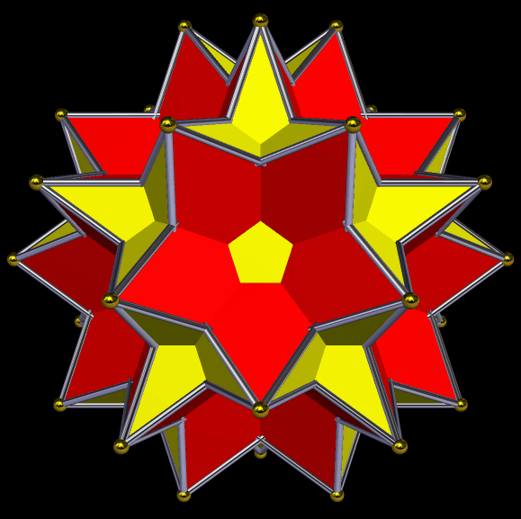 To make the polyhedron shown above, I started with the great icosahedron, then applied the “morph duals by truncation” function in Stella 4d (a computer program available, with a free trial download, here). The faces of this polyhedron are twenty equilateral triangles, in red, and twelve regular star pentagons, colored yellow. [Later edit: the solid above is called the great icosidodecahedron, and is one of the uniform solids, although I did not realize this immediately.]