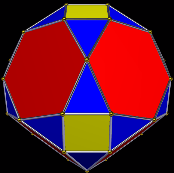 I made this solid from the truncated octahedron using Stella 4d‘s “morph duals by truncation” function. It has, as faces, six squares, eight regular hexagons, and 24 isosceles triangles. If you’d like to give Stella a try yourself, for free, the site to visit is http://www.software3d.com/Stella.php.