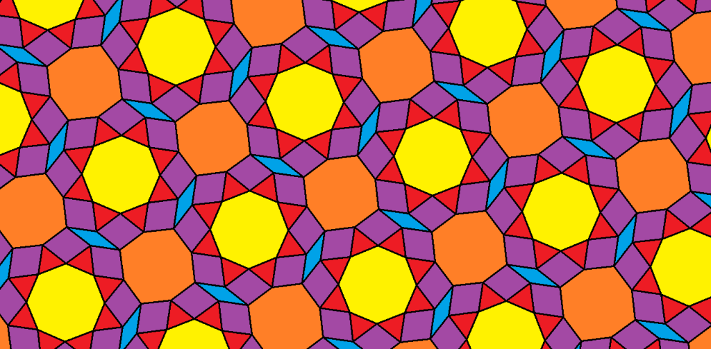 This symmetrohedron’s regular faces are twelve pentagons, thirty octagons, and twenty triangles. Its irregular faces include sixty yellow isosceles trapezoids, as well as sixty blue isosceles trapezoids. That makes 182 faces in all.