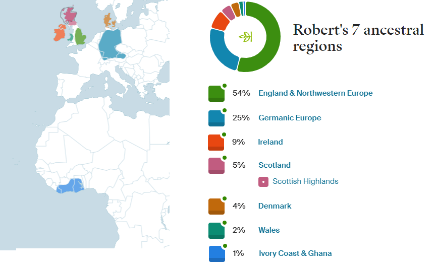 The folks at AncestryDNA just sent me this information. I was told, while growing up, that I was part Cherokee, on my father’s side, but that is apparently not the case. My mother’s map has nothing from Africa, so I can logically deduce that my recent African ancestors are on my father’s side. Of course, if you go back even further, we’re all Africans, since that is where human beings first evolved.