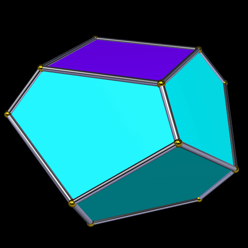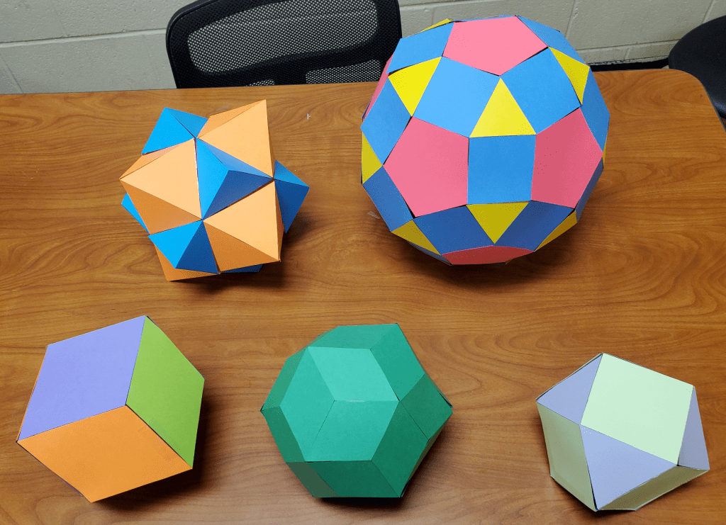 Clockwise from bottom right, these polyhedra are the cuboctahedron, the rhombic triacontahedron, the rhombic dodecahedron, the compound of the cube and the octahedron, and the rhombicosidodecahedron. They were made using card stock, compass, straightedge, scissors, and tape. Since I started blogging polyhedra, I’ve made most of my models using software, and quite a few using Zome. Making paper models was something I used to do . . . until a couple of days ago, when, on a lark, I made the cuboctahedron you see here. Bitten by the bug, I then made the other four models yesterday and today. There’s something satisfying about returning to the basics now and then.