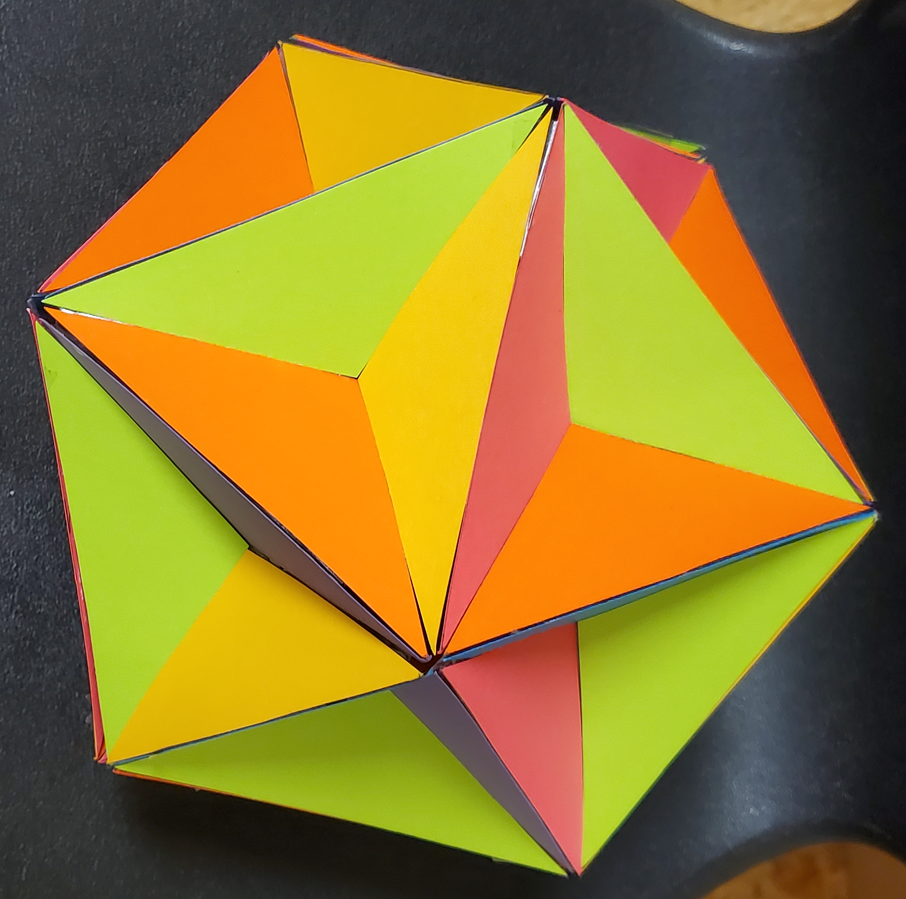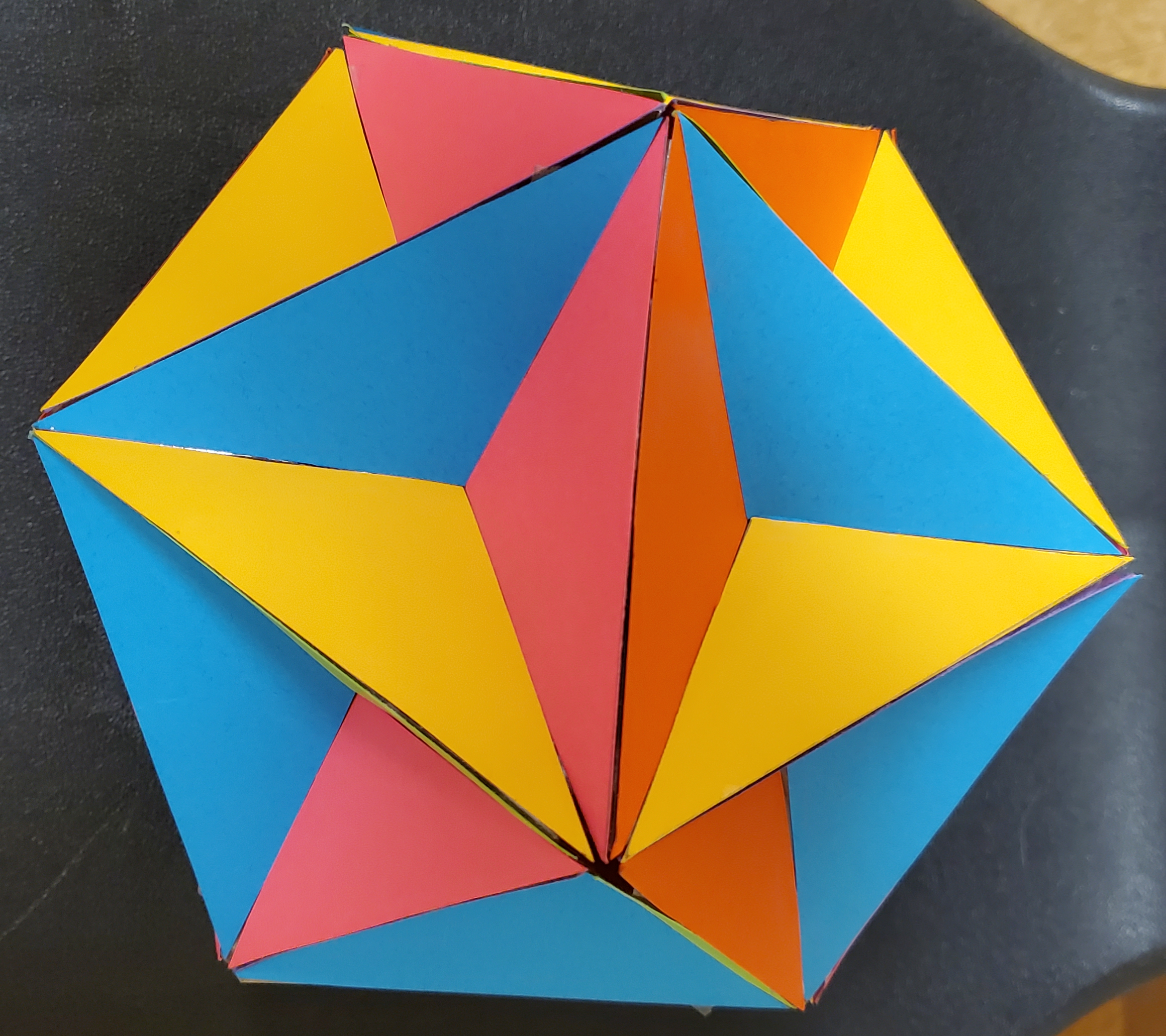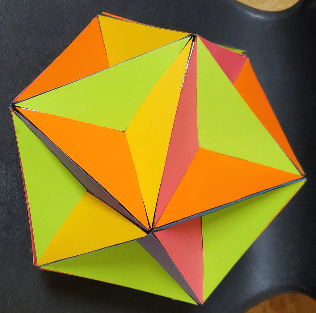 The obtuse triangles here are golden gnomons, which are isosceles triangles with vertex angles of 108 degrees, as well as base-to-leg ratios which are golden. These triangles are facelets; the actual, much larger faces are the regular pentagons of which the golden gnomons are parts. In this model, all facelets which are part of the same (or parallel) faces are all one color, with six colors of paper used, in all, for this non-convex, twelve-faced, regular polyhedron, which is one of the Kepler-Poinsot solids.