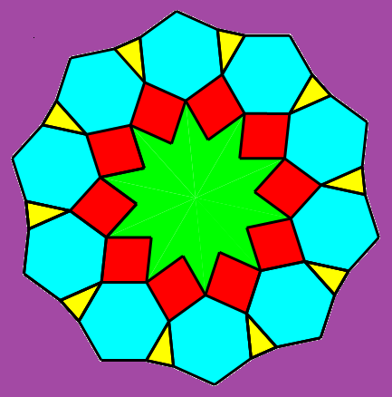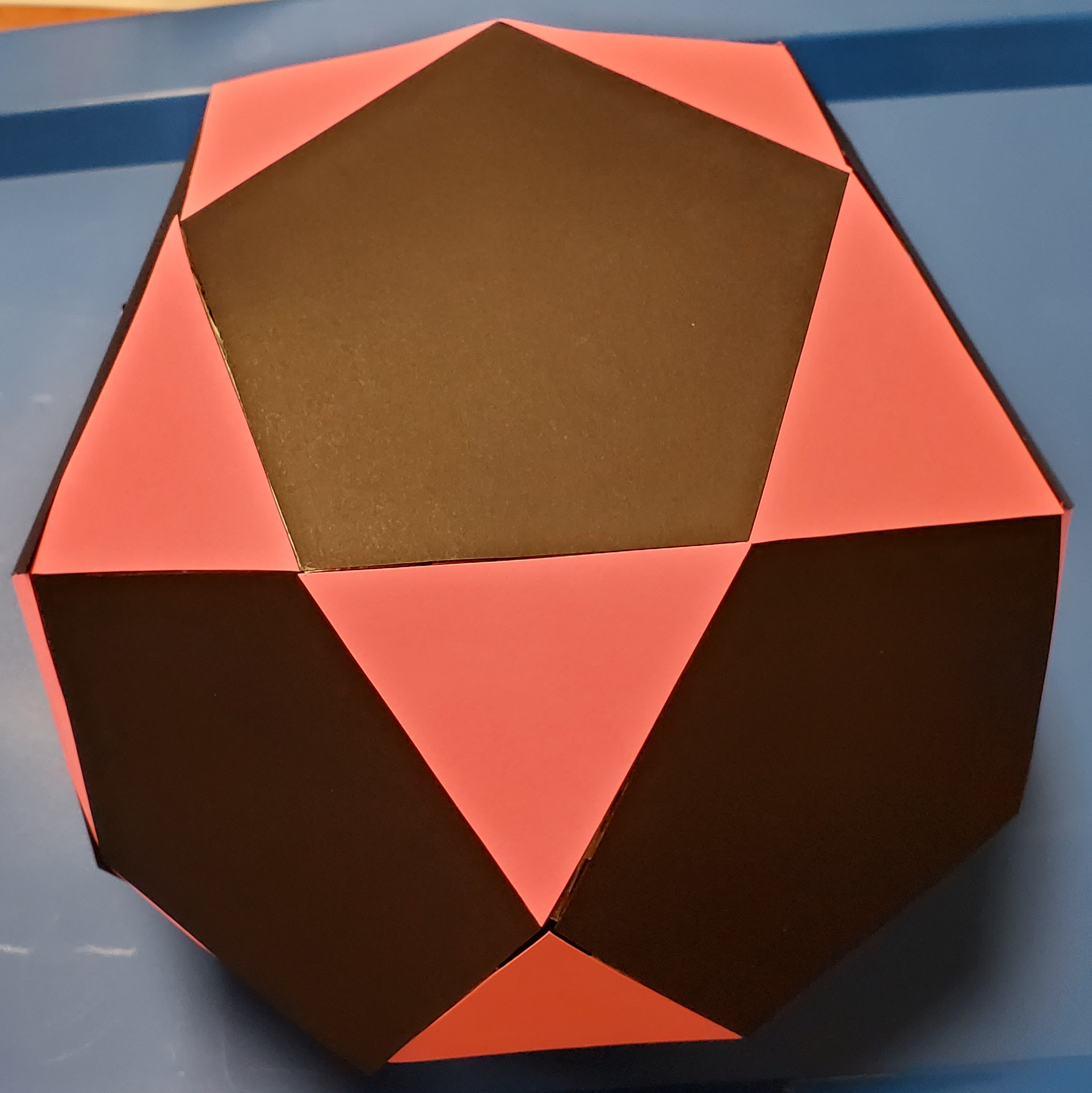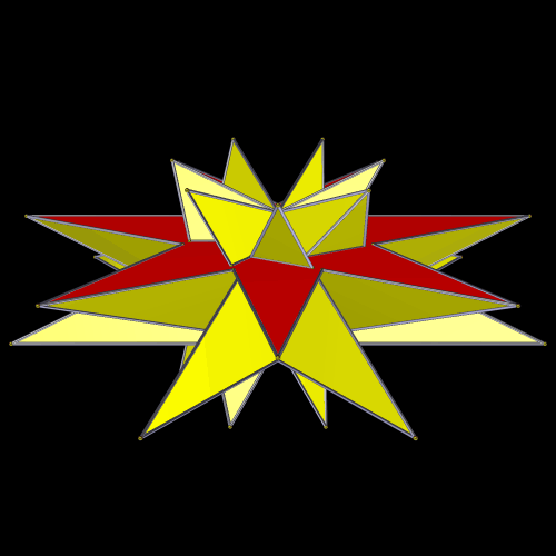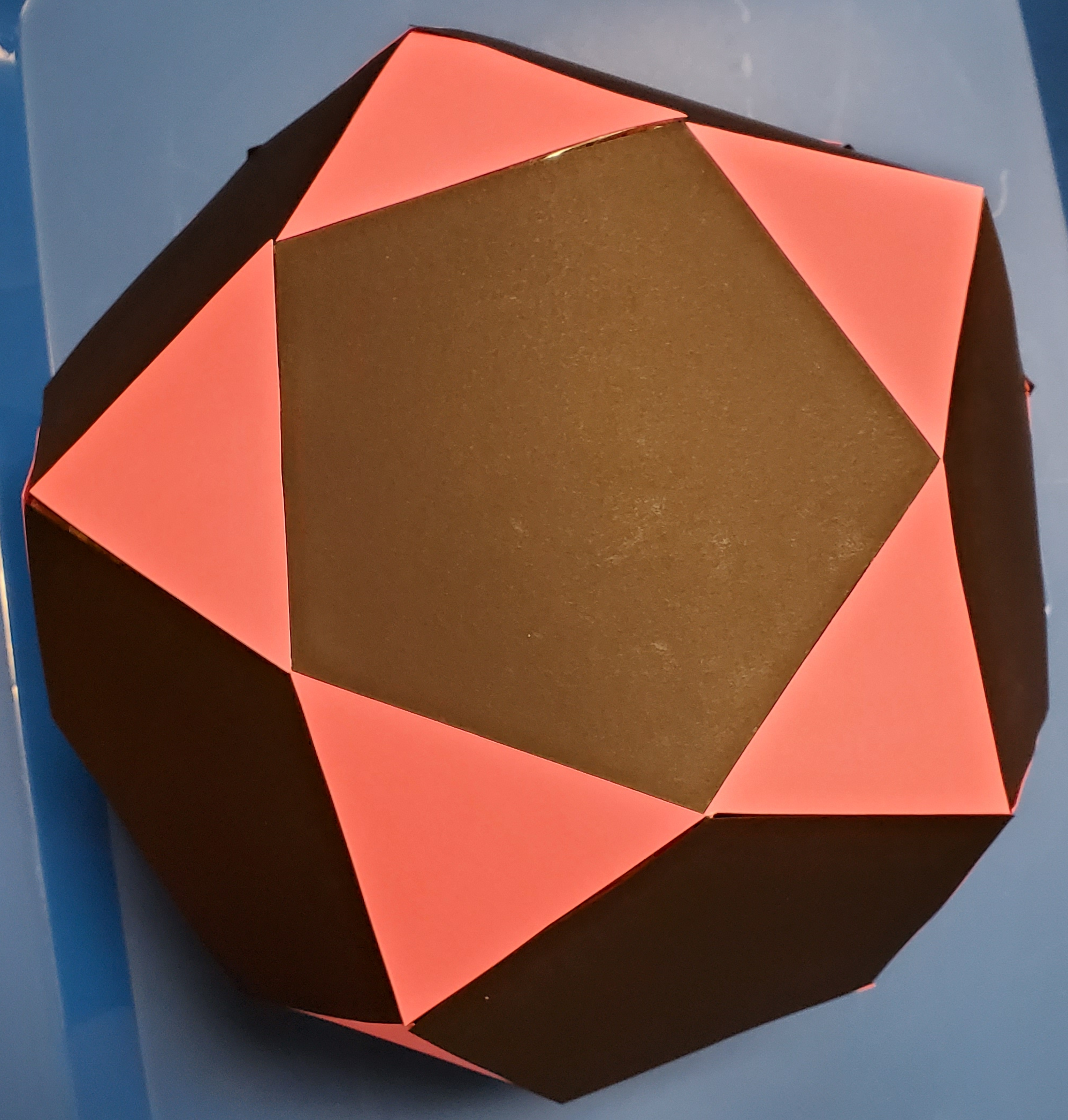 The obtuse triangles here are golden gnomons, which are isosceles triangles with vertex angles of 108 degrees, as well as base-to-leg ratios which are golden. These triangles are facelets; the actual, much larger faces are the regular pentagons of which the golden gnomons are parts. In this model, all facelets which are part of the same (or parallel) faces are all one color, with six colors of paper used, in all, for this non-convex, twelve-faced, regular polyhedron, which is one of the Kepler-Poinsot solids.