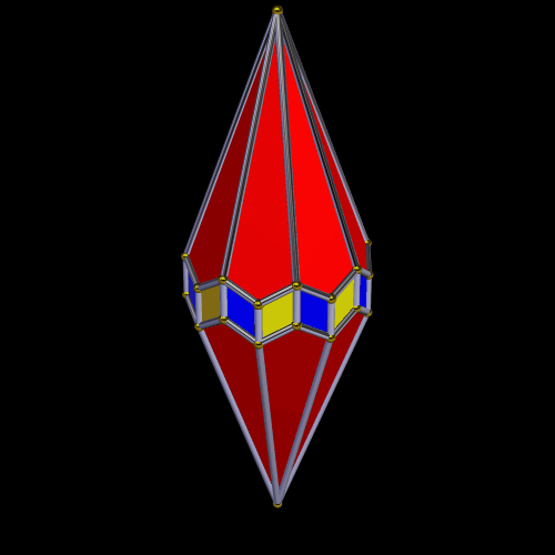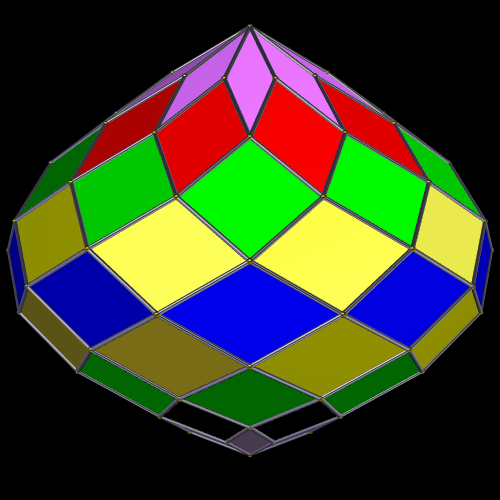 This is a zonohedrified pentagonal prism. It has ninety rhombic faces, and they are based on the vertices of that prism. I made it using Stella 4d, which you can buy, or try for free, at http://www.software3d.com/Stella.php.