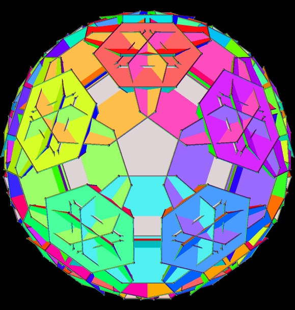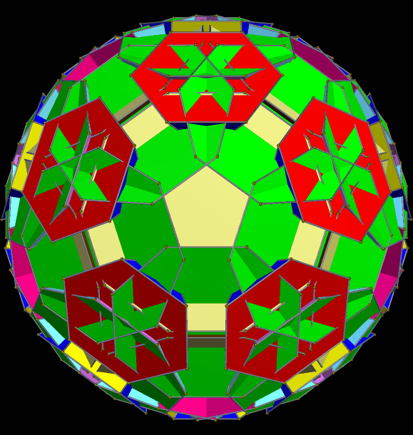 The polyhedron shown above is the final stellation of the icosahedron, while the one below is the rhombic triacontahedron’s final stellation. I made these using Stella 4d, which you can try for free at http://www.software3d.com/Stella.php.