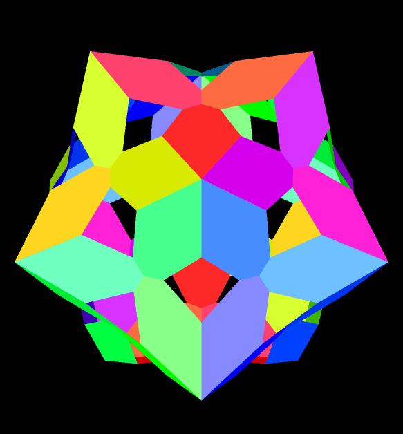 For a second look at this polyhedron, I made the triangles invisible, and then put the rest of the model in “rainbow color mode.”