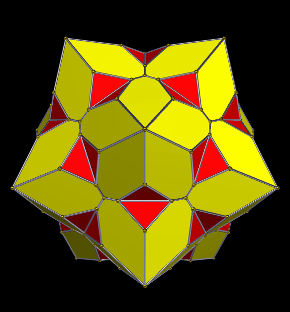 This non-convex polyhedron illustrates three related equations: 60 = (12)(5) — twelve sets of five yellow hexagons, 60 = (30)(2) — thirty pairs of red isosceles triangles, and 60 = (20)(3) — twenty sets of three yellow hexagons.