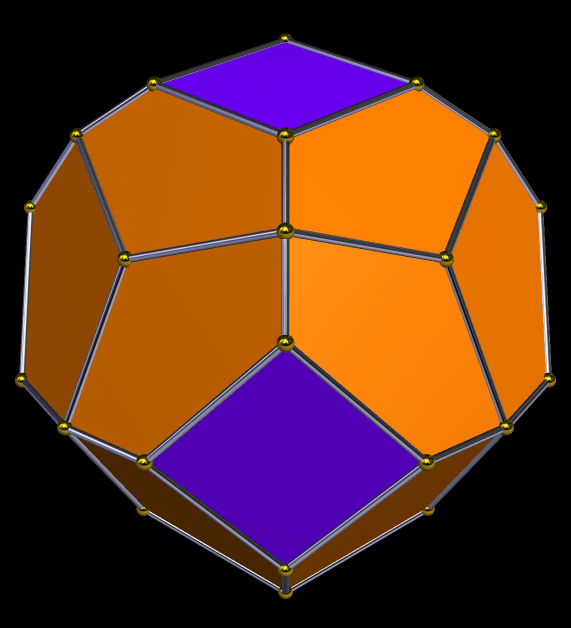 It’s also possible to do the first change in another way. When the rhombicosidodecahedron has its squares replaced with golden rectangles, rotate the golden rectangles 90 degrees, such that it increases the size of the pentagons, rather than the triangles. This has been called an “antizomeball.”
