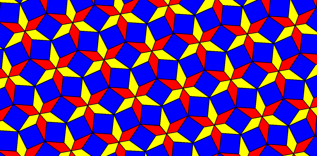 Here’s what the golden rectangles are augmented with, with the new pieces all being short blue struts. It isn’t quite a pyramid, nor is it quite a prism. Its lateral faces are two equilateral triangles and two golden isosceles trapezoids. It’s a five-faced polyhedron in need of a good name. Until someone comes up with a better name, then, I’m going to call it a golden pentahedron.