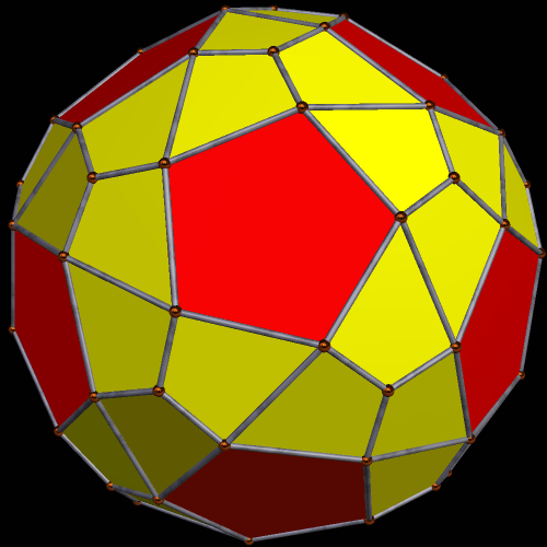 The yellow component of this compound is a rhombic triacontahedron, while the red component is a slightly-stretched version of the strombic hexecontahedron (the dual of the rhombicosidodecahedron). The compound is derived from the truncated dodecahedron, and I made it using Stella 4d, which you can try for free right here.