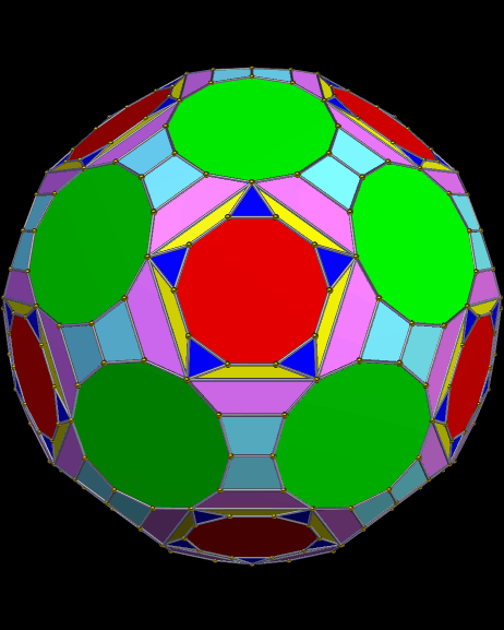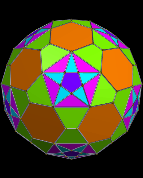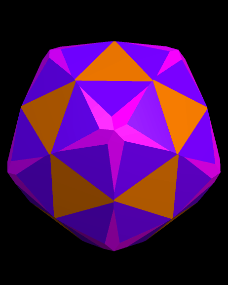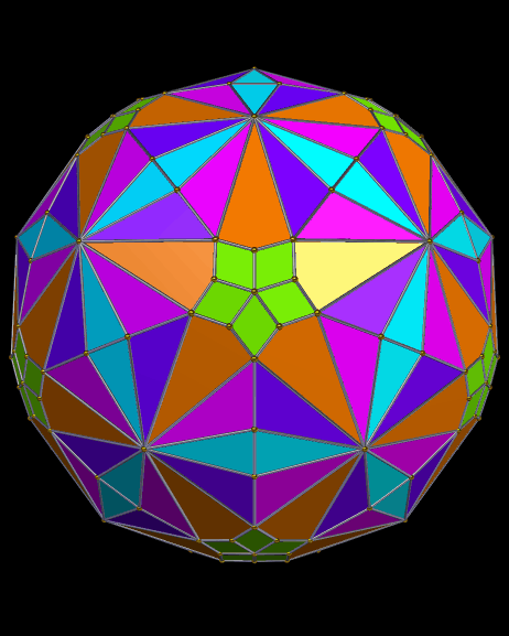 Why wasn’t it helpful? Simple: all sixty faces are of the same type. It can be made more attractive by putting Stella 4d into “rainbow color” mode, but I cannot claim that helps with comprehension of the compound.