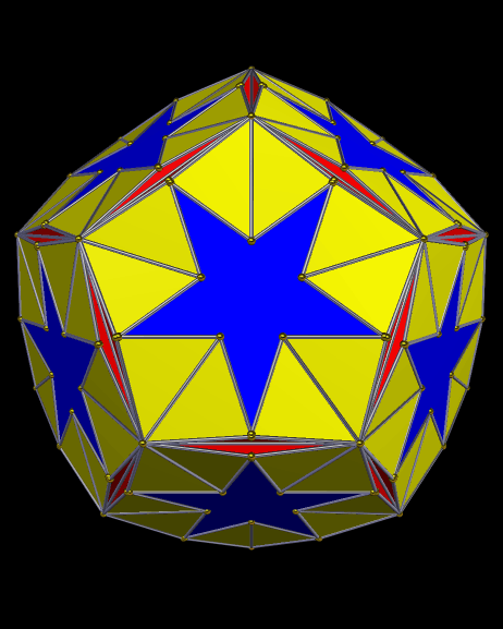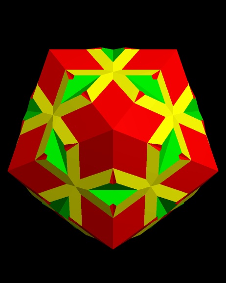 The yellow regions above are from a triangular face of the yellow component, while the blue regions are from a blue triangular face. The equilateral triangle in the center, being part of both the yellow and blue components, must be assigned a “compromise color” — in this case, green. The necessity of such compromise-colors can make understanding the compound by examination of an image more difficult than it with with, say, the compound of five cubes (not shown, but you can see it here, if you wish). Therefore, I decided to look at this another way: coloring each face of the five-cuboctahedra compound by face type, instead of by component.