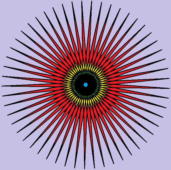 I was born 51 years ago today. To mark the occasion, here’s a 51-pointed star. It’s made of {17/7} heptadecagrams repeated 3 times, and with their edges extended as lines, in three different colors. This works because 51 = (17)(3).