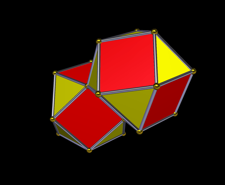 Above and below, you will find two different coloring-schemes for this particular cluster of polyhedra. I made both of these rotating images using Stella 4d, software you can buy, or try for free, right here.