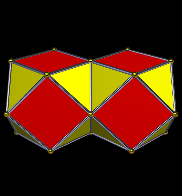 Above and below, you will find two different coloring-schemes for this particular cluster of polyhedra. I made both of these rotating images using Stella 4d, software you can buy, or try for free, right here.