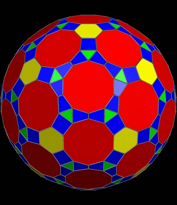 The first polyhedron shown here is also a symmetrohedron. 42 of its faces are regular decagons, and twenty are equilateral triangles. There are also sixty each of two types of isosceles trapezoids. That’s 182 faces in all.