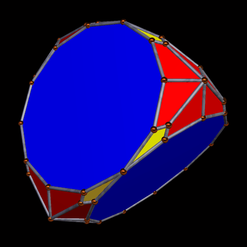 Applying yet another truncation, of a specific type, produces the next polyhedron. Here, the regular dodecagons are blue, and the red triangles are equilateral. The yellow triangles are isosceles, with a vertex angle of ~41.4 degrees.