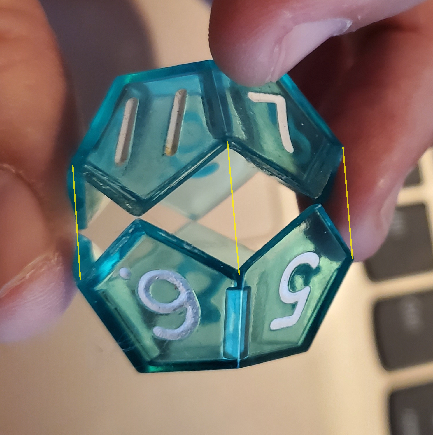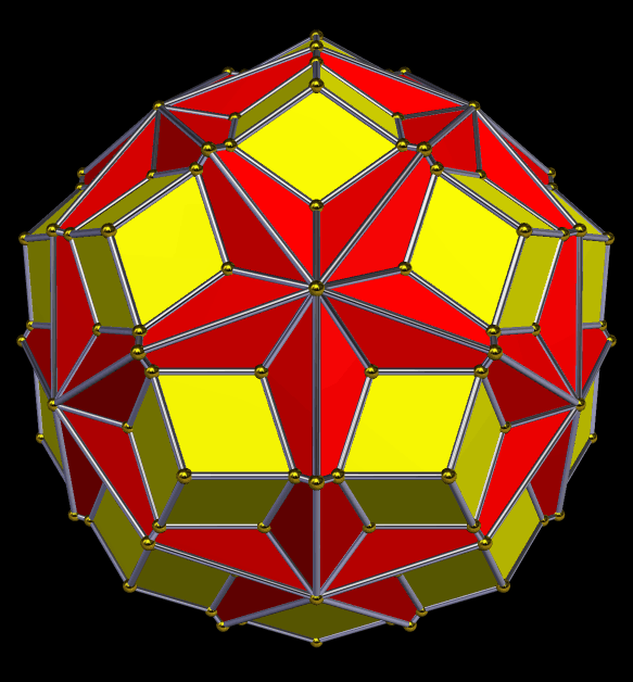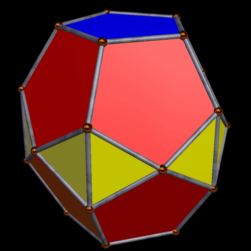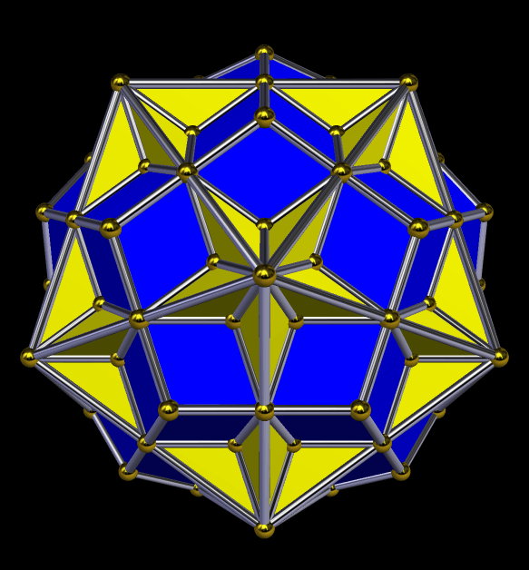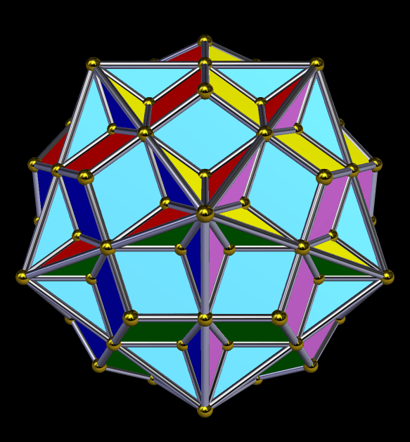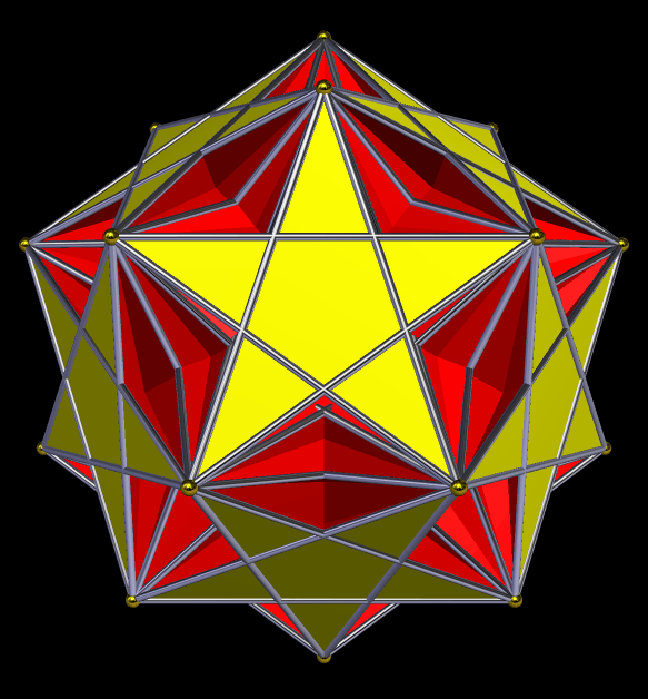 The obtuse triangles here are golden gnomons, which are isosceles triangles with vertex angles of 108 degrees, as well as base-to-leg ratios which are golden. These triangles are facelets; the actual, much larger faces are the regular pentagons of which the golden gnomons are parts. In this model, all facelets which are part of the same (or parallel) faces are all one color, with six colors of paper used, in all, for this non-convex, twelve-faced, regular polyhedron, which is one of the Kepler-Poinsot solids.