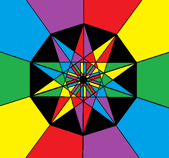 The Platonic Icosahedron has twenty faces which are equilateral triangles. In the Golden Icosahedron, twelve of those triangles (the yellow ones) have been replaced by acute, isosceles triangles with a leg:base ratio which is the Golden Ratio.