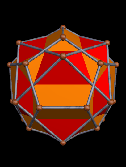 Shown above: the compound of the icosahedron and the rhombic dodecahedron. Below is its dual, the compound of the dodecahedron and the cuboctahedron.