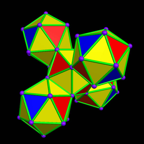 If, on the other hand, this augmentation is performed only on the blue faces of the central icosahedron, the result is a tetrahedral cluster of five icosahedra: