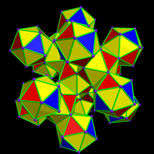 In the last post on this blog, there were three images, and the first of these was a rotating icosahedron, rendered in three face-colors. After making it, I decided to see what I could build, using these tri-colored icosahedra as building blocks. Augmenting the central icosahedron’s red and blue faces with identical icosahedra creates this cubic cluster of nine icosahedra: