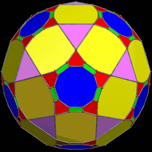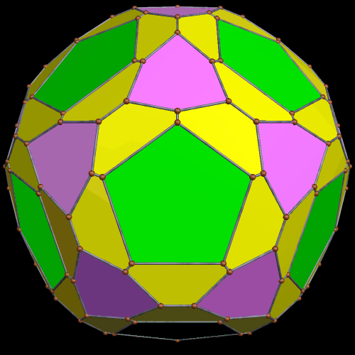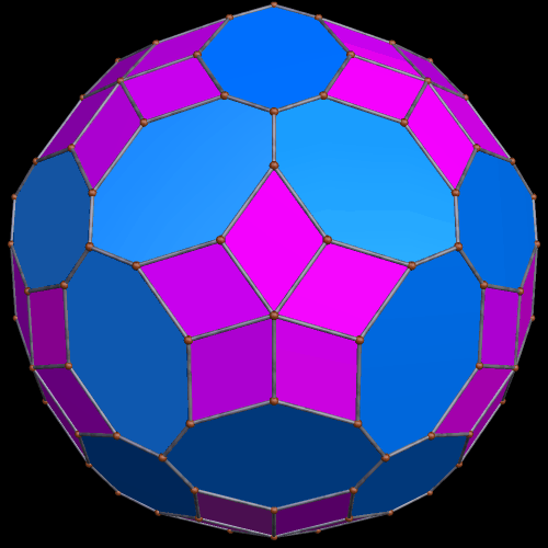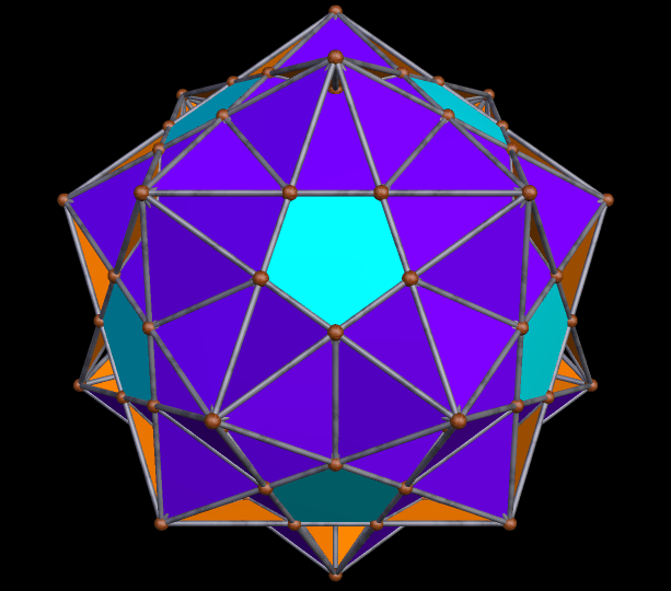 These two compounds, above and below, are duals. Also, in each of them, one polyhedron with icosidodecahedral symmetry is combined with a second polyhedron with cuboctahedral symmetry to form a compound with pyritohedral symmetry: the symmetry of a standard volleyball.