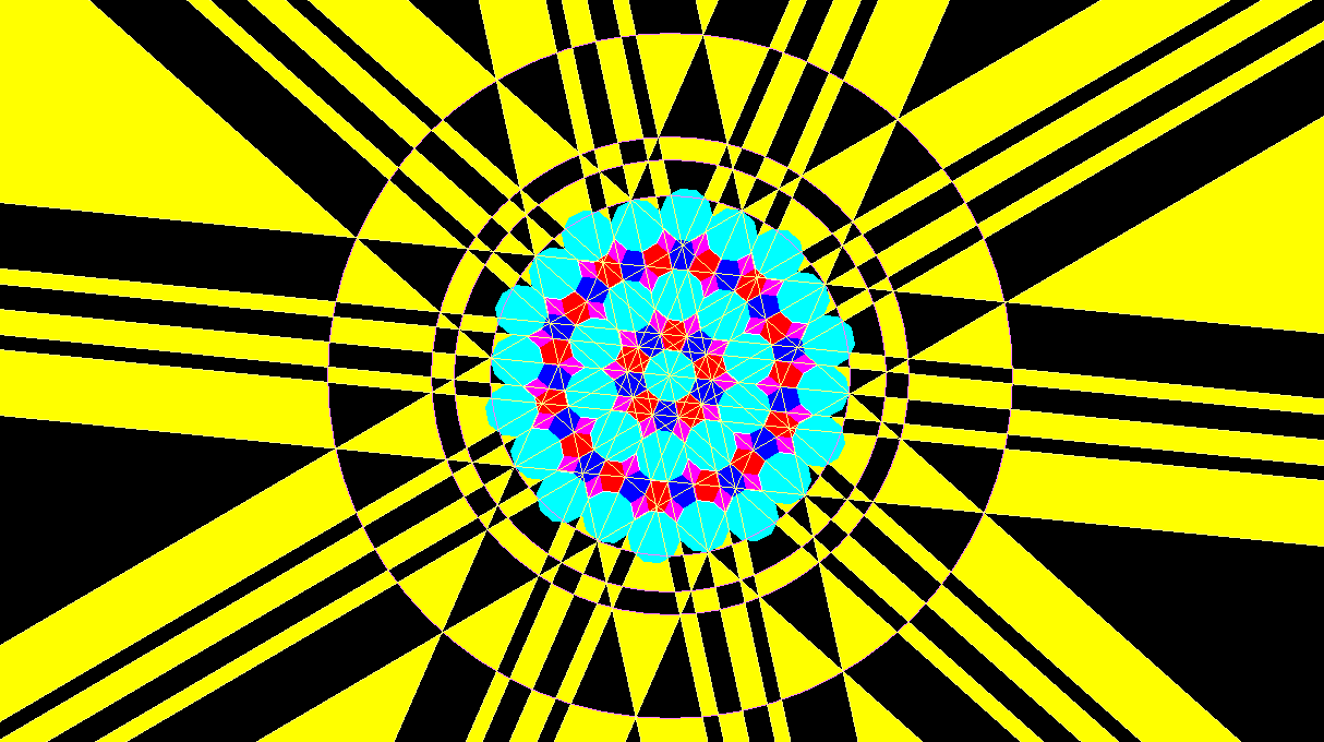 The image on the squares is the same that appears two posts ago here, its color-inversion appears on the hexagons, and these were created with Geometer’s Sketchpad and MS-Paint. Projecting those images onto the larger faces of this polyhedron, and then creating this rotating .gif file, was accomplished with the use of Stella 4d, polyhedron-manipulating software you can try and/or buy at http://www.software3d.com/stella.php.